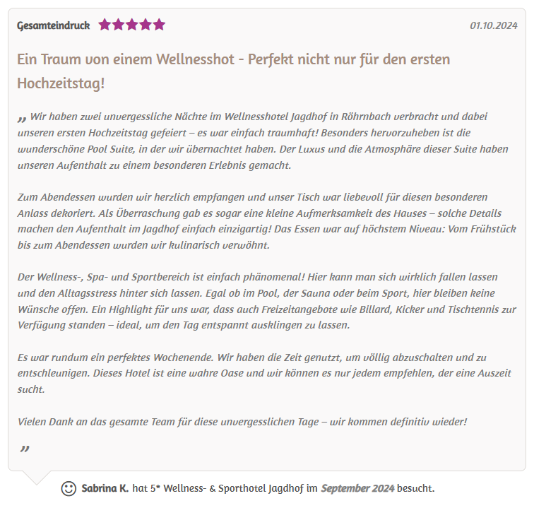 Beim Bewertungsgewinnspiel 2024 wurde die Bewertung von Sabrina K. für das 5* Wellness- & Sporthotel Jagdhof gezogen: